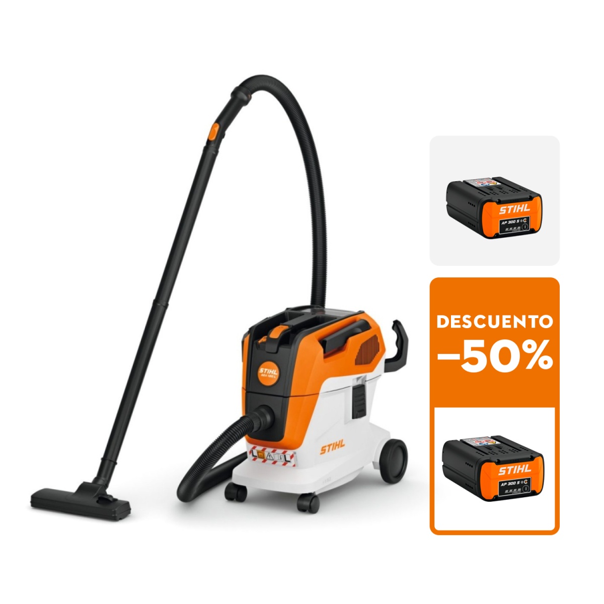 Aspiradora de batería STIHL - SEA 100 L, sin batería ni cargador + Batería STIHL AP 300 S + (Batería STIHL AP 300 S - 50%)