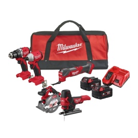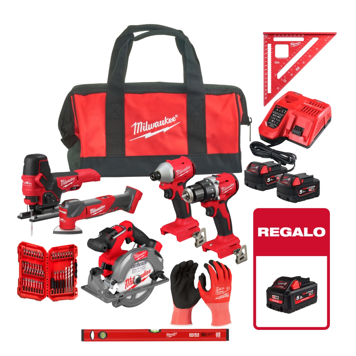 Combo profesional Milwaukee 5 en 1: taladro, impacto, sierra circular, multiherramienta y sierra de calar.