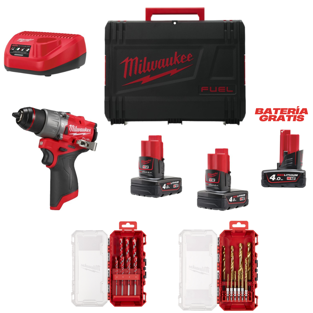 Taladro percutor subcompacto Milwaukee - M12 FPD2-402X, M12 FUEL™ + Juego de brocas