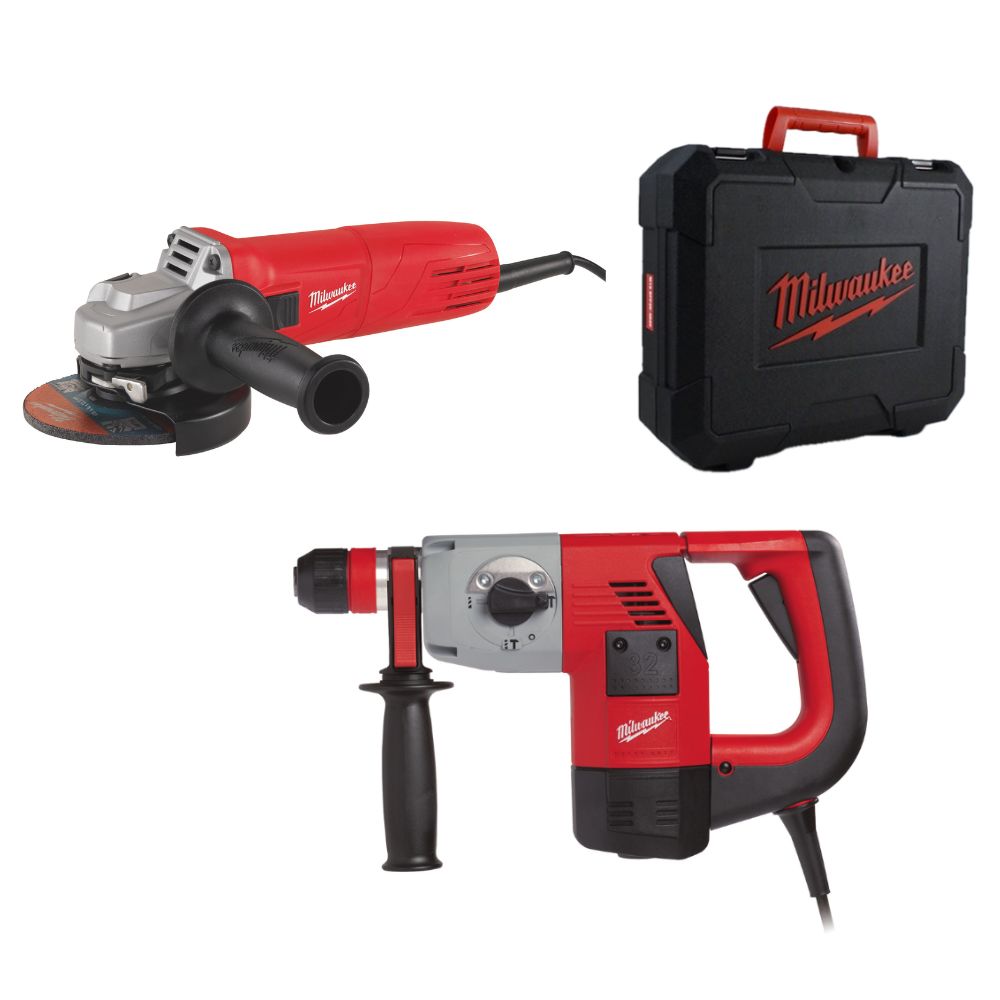 Martillo combinado Milwaukee - PLH 32 XE , SDS-Plus de 900W, FIXTEC™ + Amoladora angular, AG10-125EK de 1000W